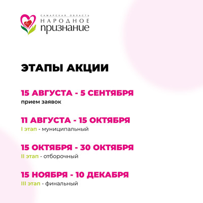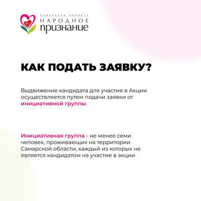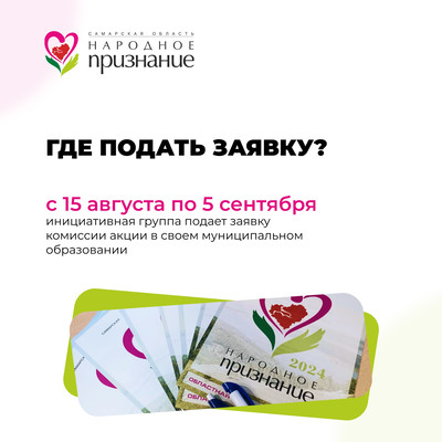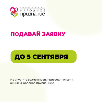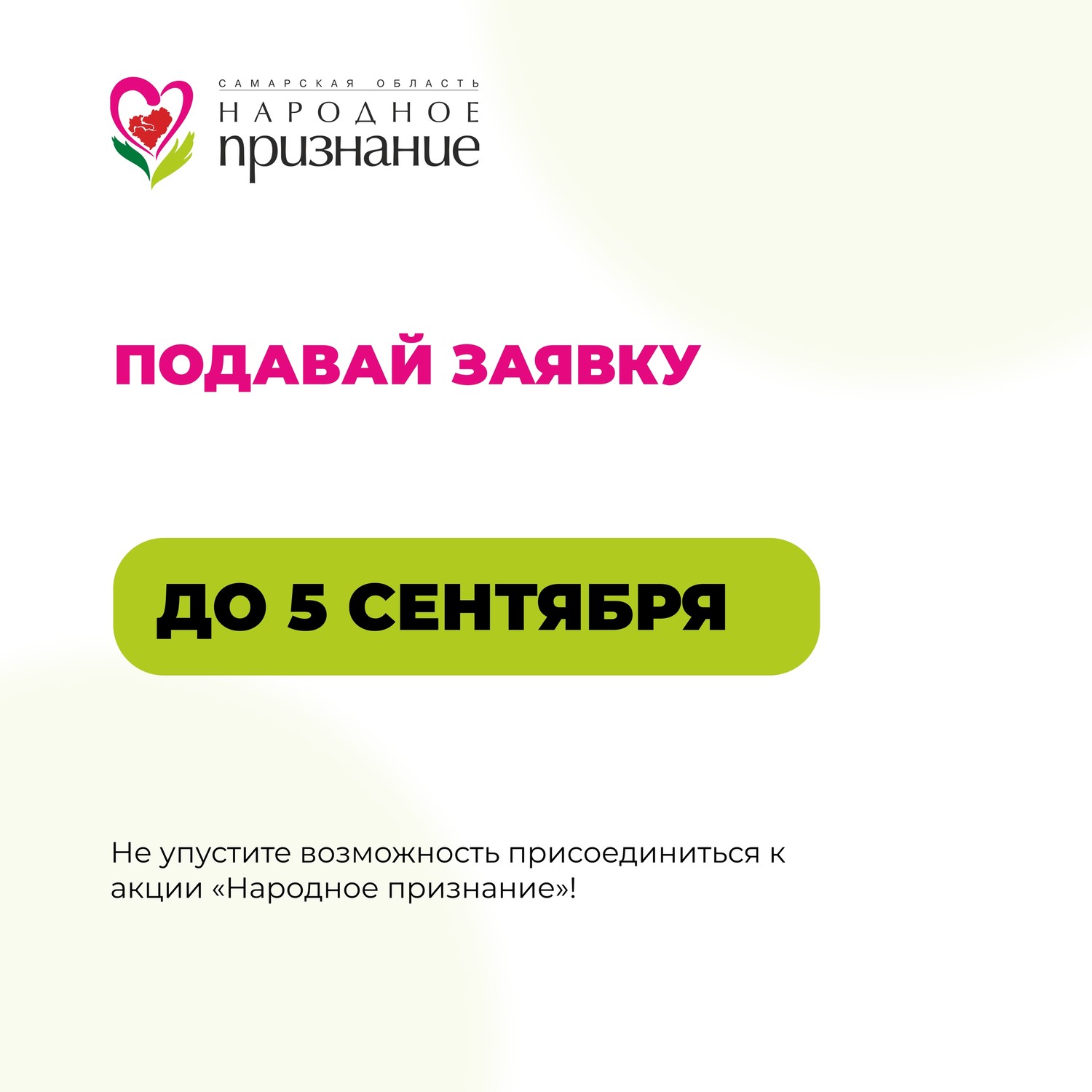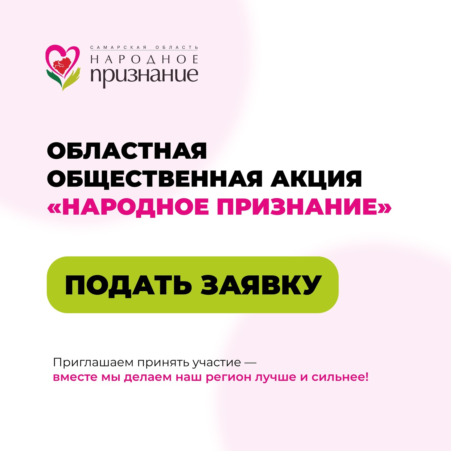 Начинается прием заявок на участие в областной общественной акции «Народное признание», которая проводится с целью формирования и развития современных жизненных ценностей и нравственных ориентиров у жителей Самарской области.