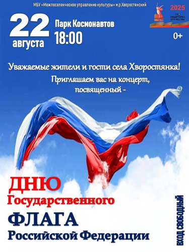 Приглашаем вас 22 августа в 18:00 в парк Космонавтов с.Хворостянка на концертную программу, посвященную Дню государственного флага Российской Федерации.